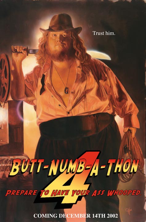 As for you OnLiners, Out-of-Staters and Geeks Overseas... Here's how you get tickets. The last several years we've done the Send your Email Lottery fashion and frankly... that's no fun. So this time, I'm gonna have fun with it. On October 19th, 2002 at 12 Noon Central Standard Time (that's 1pm East Coast, 2pm Atlantic Time, 11am Mountain and 10am Pacific) you must send an essay no longer than 500 words describing exactly why you deserve to go to Butt-Numb-A-Thon 4 instead of your best friend, where you are from and a why this is important to you. Feel free to be silly, serious, whatever. And don't worry... Your best friend will be there, if you are because each winner gets an option to buy 2 tickets... It'll just be fun The E-mail address is Bnat4@aintitcoolmail.com OH... and here's a couple of rules. If you send your submission twice you'll be thrown out. If you send the same essay under different names you'll be thrown out. The submissions will only be accepted for as many emails as this email box can hold. So be prompt!