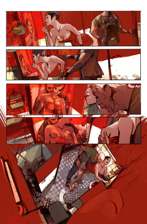 RR: Well, tonally it sets the stage for what you’re going to be seeing in the book: it’s brutal. It defines Graham, it defines the world around them, and it defines the heist…so for me it was a matter of in a 7 or 8 page sequence I got to set up the world. It’s interesting that you said it wasn’t an exposition-dump, because it kind of WAS, but I think the art of opening a story and getting the exposition dealt with is finding a way to do it where it DOESN’T feel like you’re dealing with an exposition dump and to me, having Graham torture Enrique…it was an opportunity to A: have them discuss the job that Enrique has screwed up, costing Graham his crew to finish the job, B: again it showed how mercenary and brutal Graham can be, AND via their conversation, set the stage that there’s not going to be any opportunity to do this in a couple more weeks, so it sets up that ticking time-bomb in the distance.