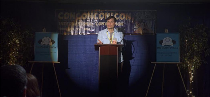 CLAY: it’s a combination of like 5 things. Hopefully a relatively seamless combination. We were worried about how seamless it would seem. We shot some B-roll initially with the participation of both Wizard World in Austin and Comicpalooza in Houston. Before we got out cast, we did some B-roll shooting in Austin, and then when we got our cast, we actually just took them as a weekend by themselves with a skeleton crew to Comicpalooza, shot some of the larger scenes, the ones that are like vista shots. If you notice, there’ll be scenes where like, “Wow, look at this crazy thing we walked into. Let’s go over to this corner and have a conversation now.” And then to recreate that, we actually recreated part of it at the Marchesa Theater where we’re premiering tonight. The second screening tonight is actually at a location we subbed for the Comic-Con, along with a hotel in south Austin. We use a lot of pipe and drape to sort of hide transitions. A lot of pipe and drape happening in this movie. It’s a term I use a lot, “pipe and drape”. But yeah, it was a combination of many, many things, and no one is more amazed than I am at how seamlessly it held together.